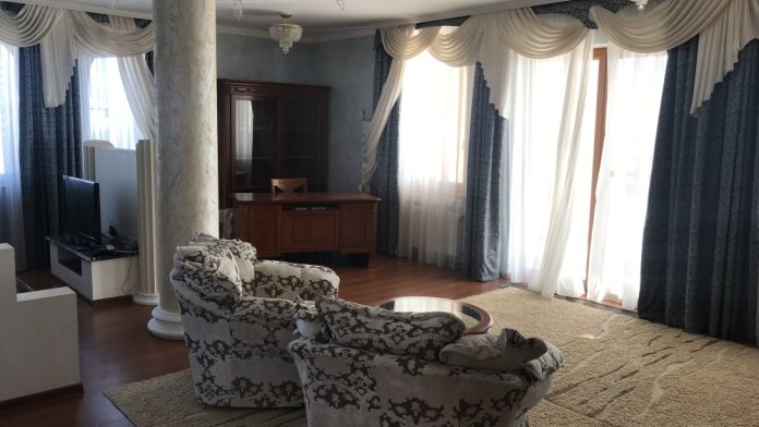 Кухня оборудована всем необходимым: посудомойка, СВЧ, кофеварка, холодильник, электроплита, кулер. 2 санузла: один с джакузи, другой с душем, фены, гладильная зона.