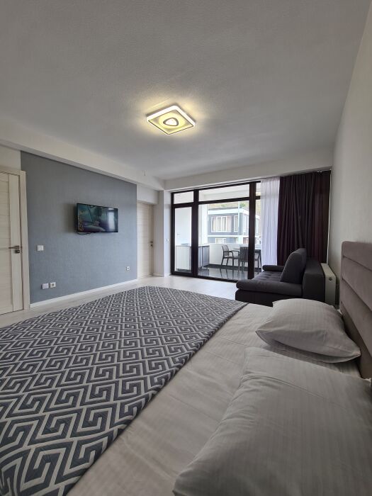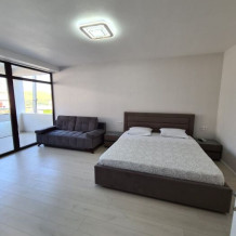 Мы предлагаем для Вас семейные номера со всеми удобствами, большой террасой и своей мини-кухней. В комнате стоит большая кровать «king size» 180х200 и раскладной диван 140х200.