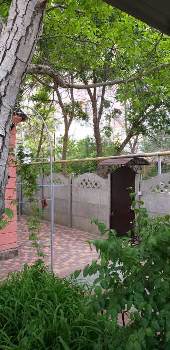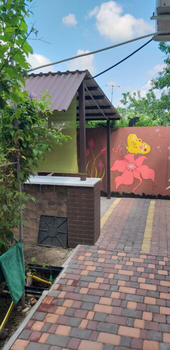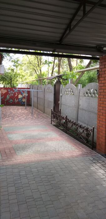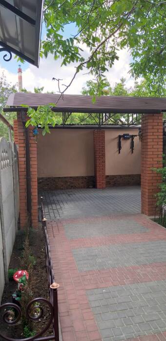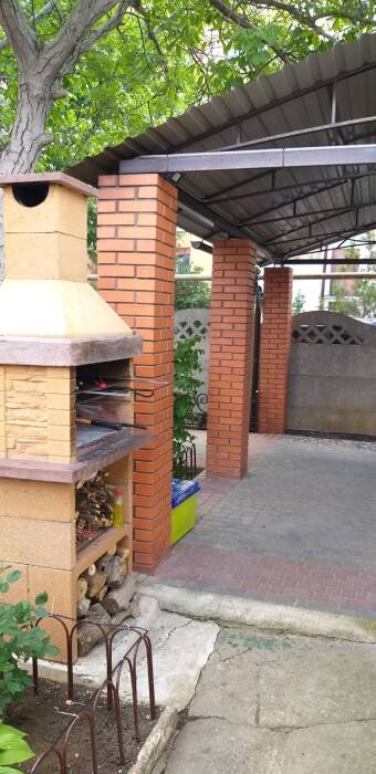 Во дворе большой навес, столик со стульями, зеленый дворик, мангал-все для отличного отдыха, стоянка для машины, (автоматические ворота) во дворе и большая площадка, мощенная плиткой около дома, там тоже можно ставить машину.