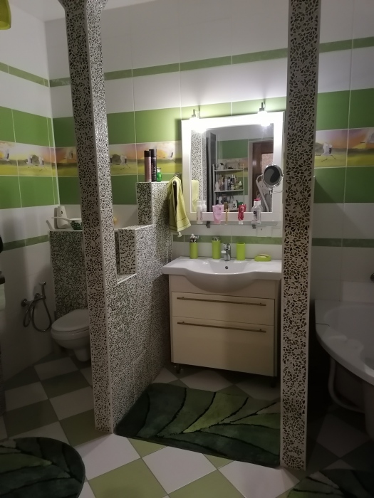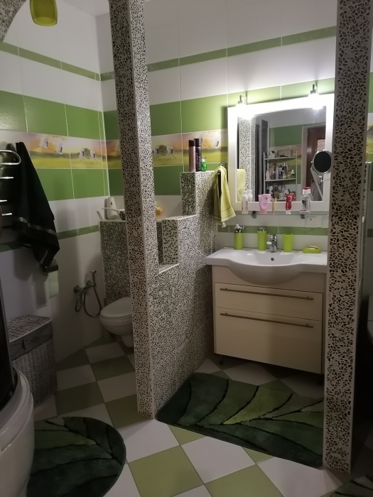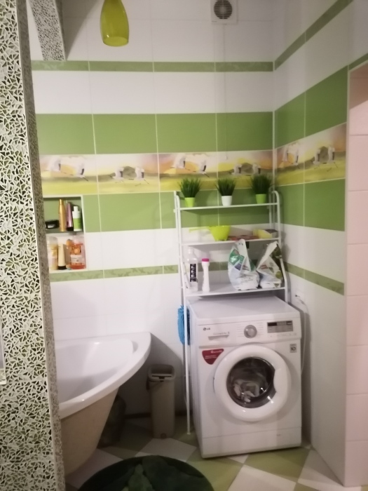 В ванной комнате: ванна с душем, гидробокс, горячая и холодная вода круглосуточно, машинка-автомат.
