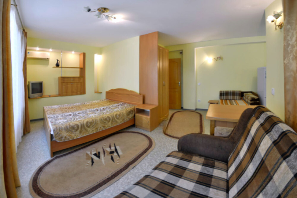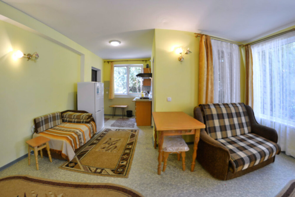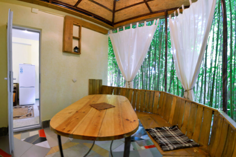 В номере есть все необходимое для курортного отдыха. Возле номера крытая Терраса с кухней и обеденной зоной. Окна выходят в сад. Прохладно и зелено.