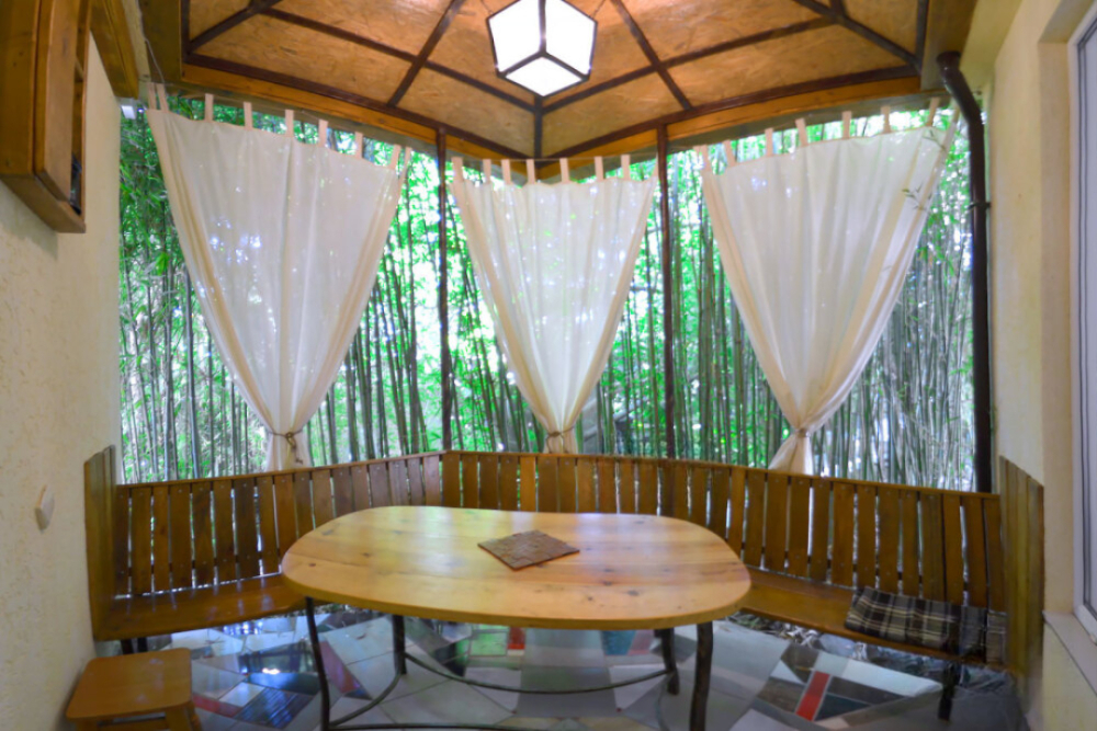 Терраса со столом закрытая бамбуком.