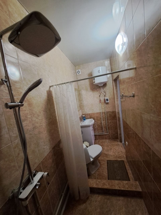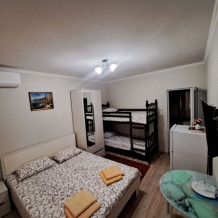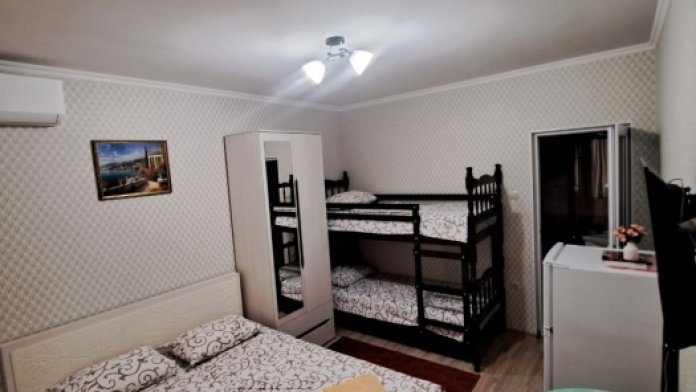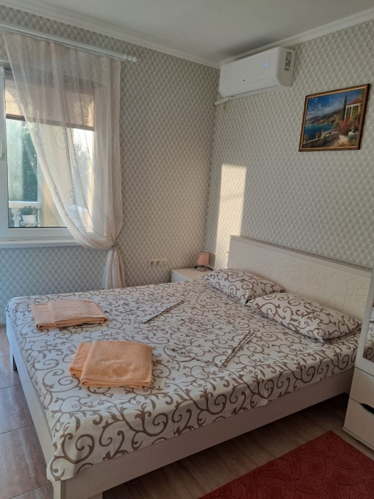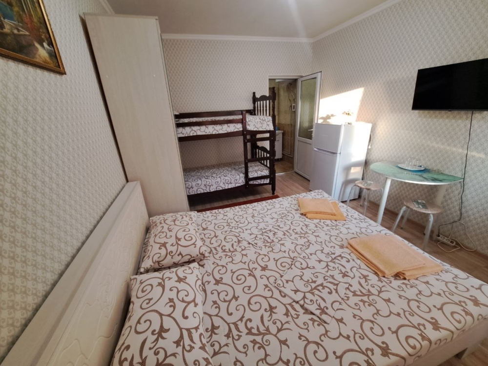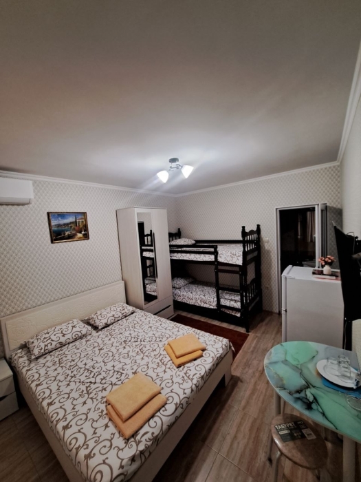 Новый светлый и просторный номер для семьи 2+2 со всеми удобствами. Номер площадью 25м2. Двуспальная кровать, двухъярусная для детей, холодильник, телевизор, кондиционер, просторный санузел, балкон с садовой мебелью.