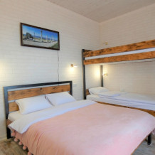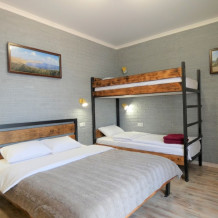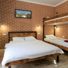 В каждом номере: дизайнерский ремонт в стиле лофт, мебель из экологически чистых материалов, санузел с душем, кондиционер, телевизор, бельевой шкаф, стиральная машина, холодильник. Кухня и все необходимое для приготовления еды - на два номера.
