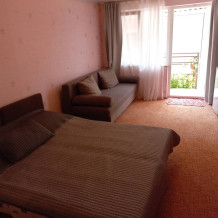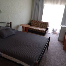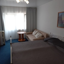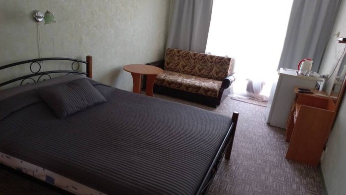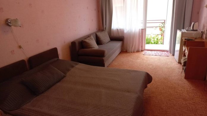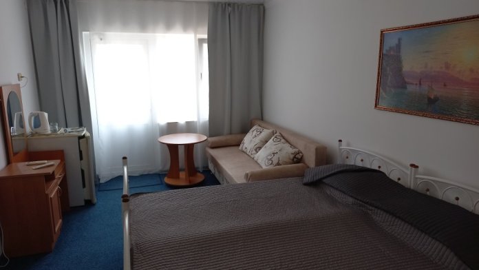 Раскладной диван на 2 человека. Большой шкаф для одежды и багажа с большим зеркалом. Туалетный столик, столик на колёсиках, холодильник, чайная группа, телевизор, интернет.