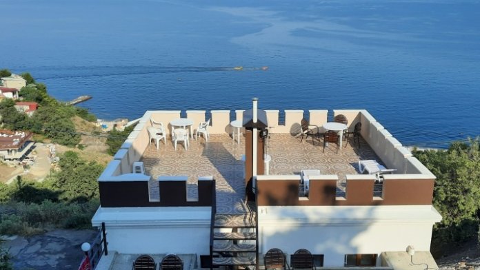 Большая терраса с видом на море на кровле, где днем можно позагорать, а вечером уютно посидеть за столиком с видом на Медведь-Гора, Судак, мыс Меганом.