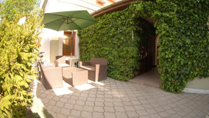 Номер с отдельным входом и двориком, есть маленькая кухня с микроволновой печью. Рядом с номером индивидуальная площадка с плетеной мебелью.