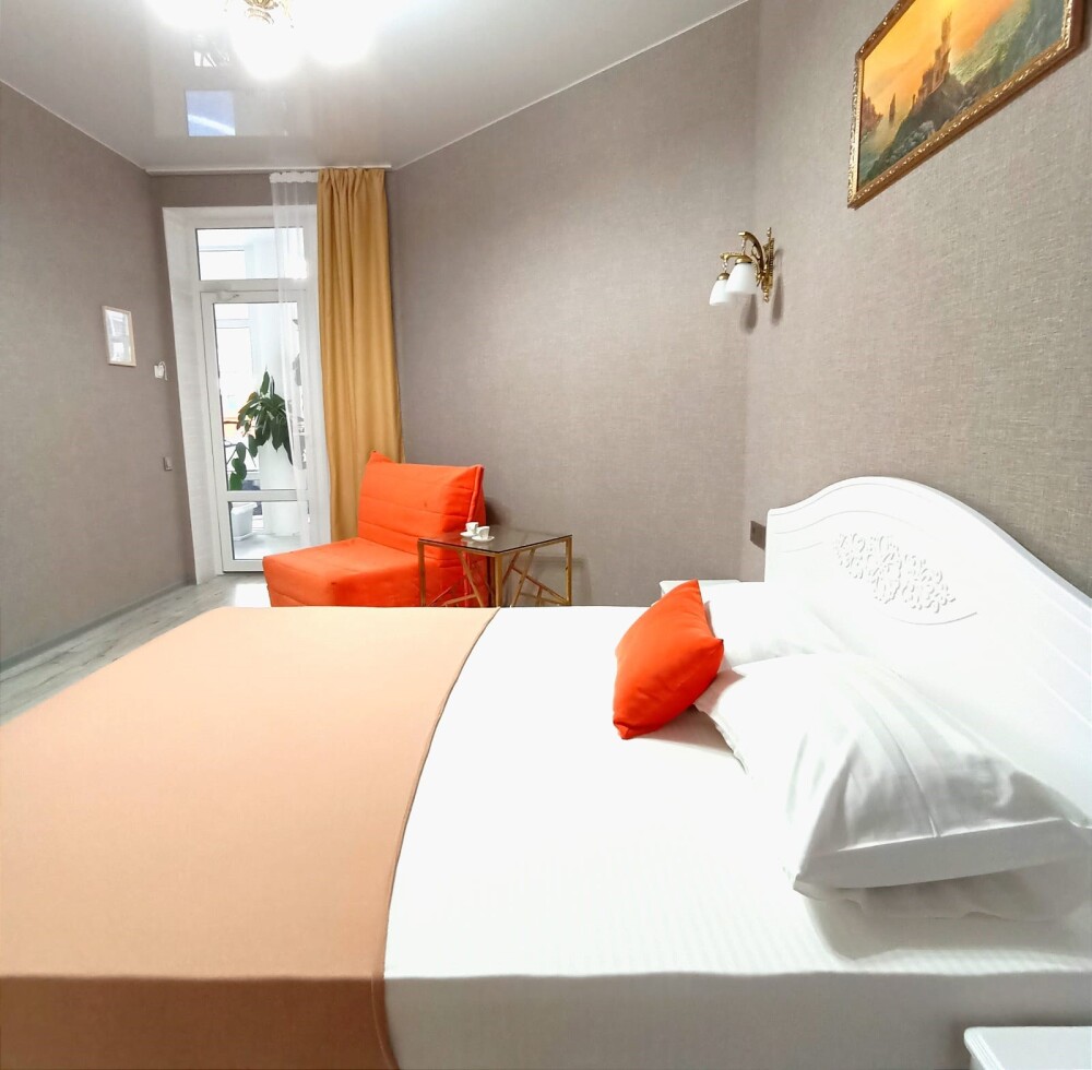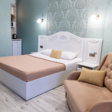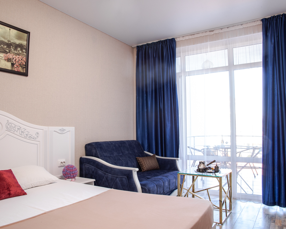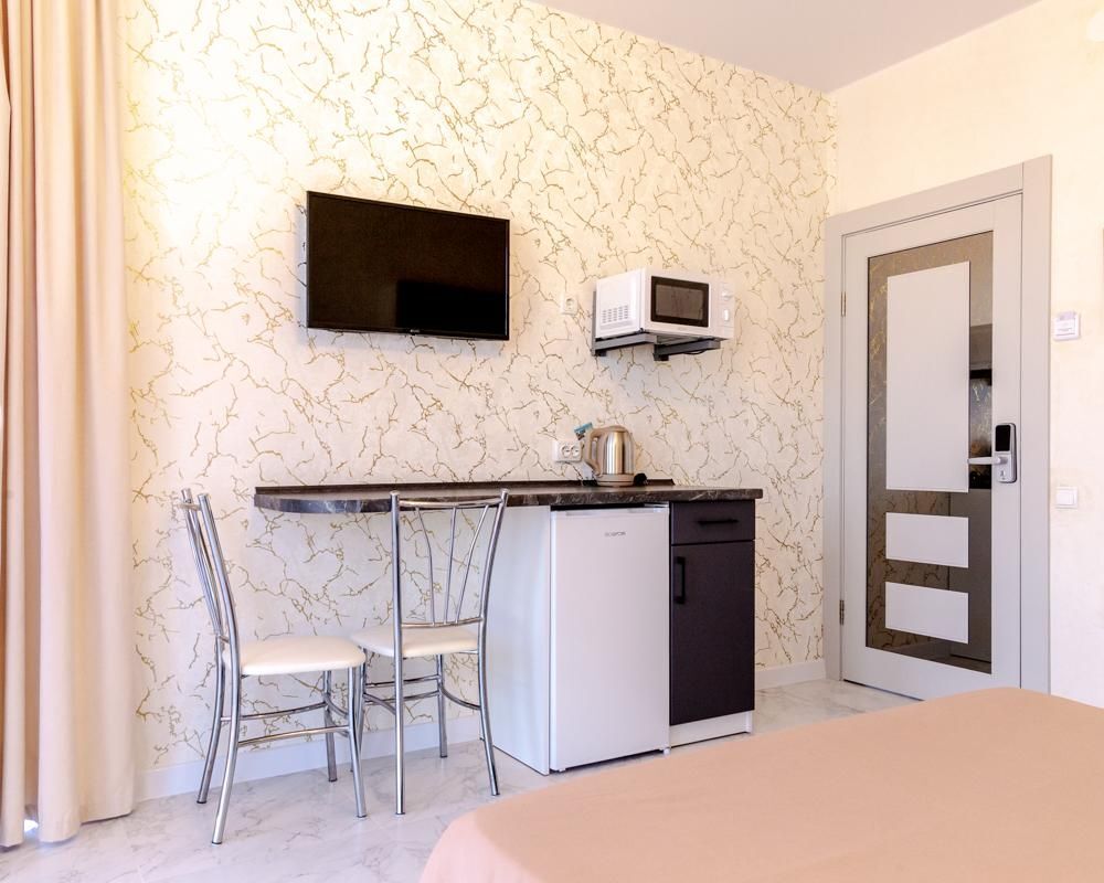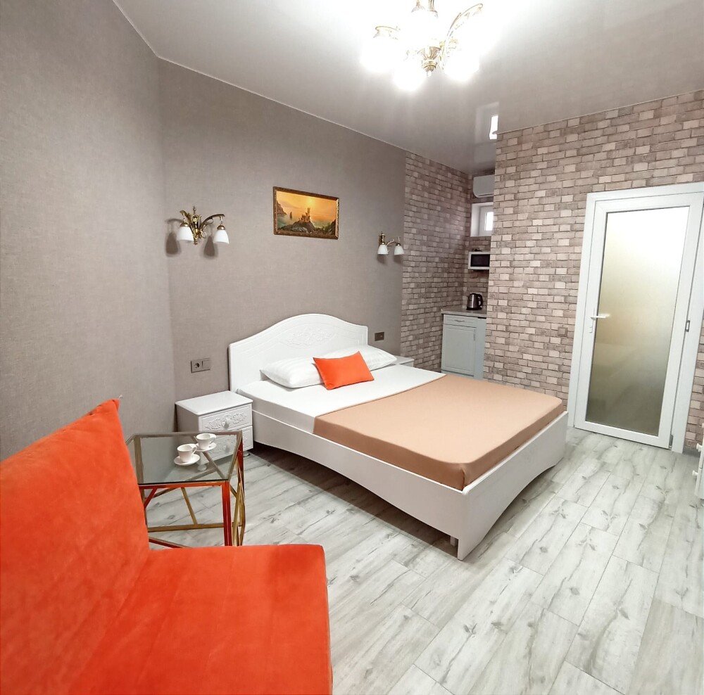 В однокомнатном номере есть мини кухня-микроволновая печь, эл. чайник, холодильник, посуда. Также: полотенца, тапочки, фен, мыло, гель для душа. Балкон общий со столиками и креслами. Бельё меняется по по требованию.