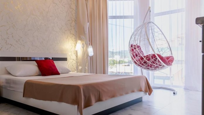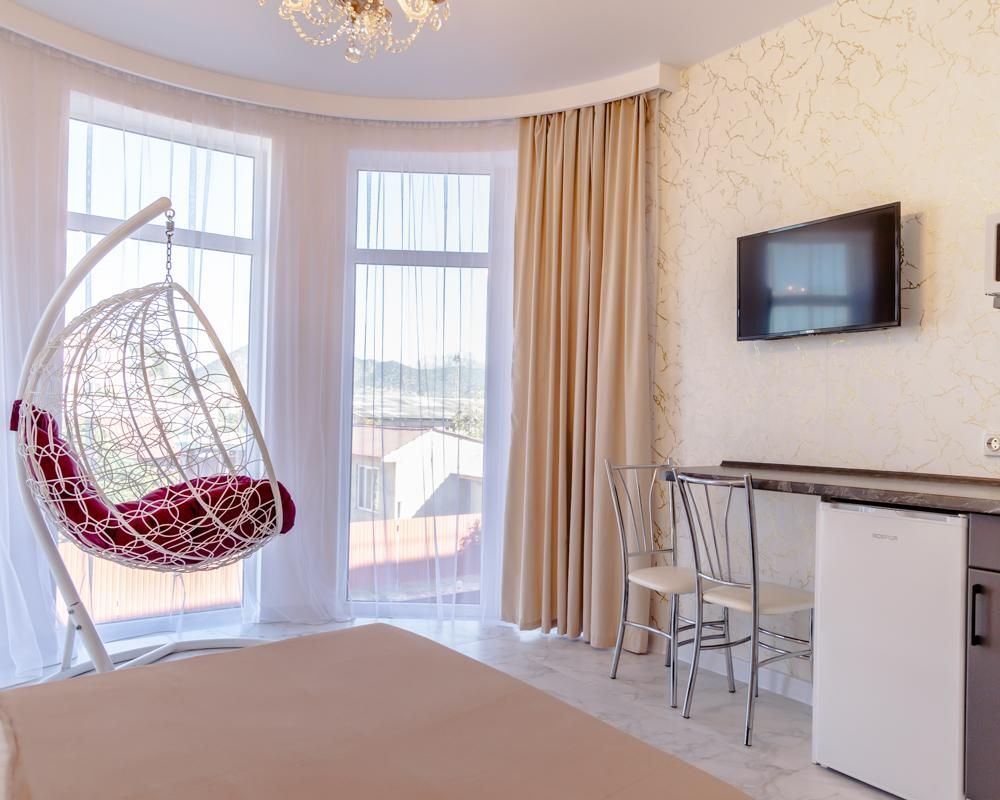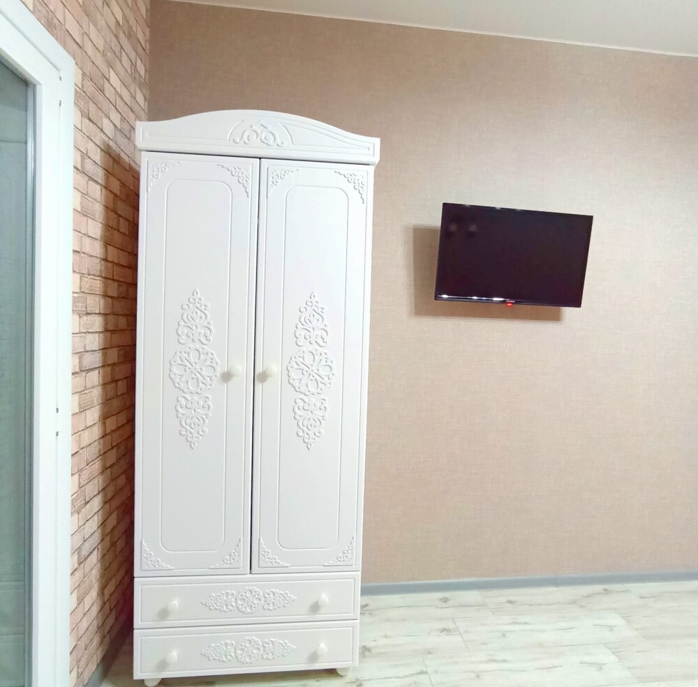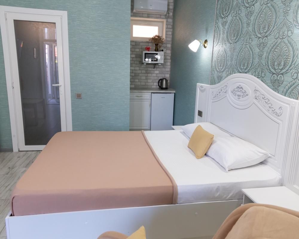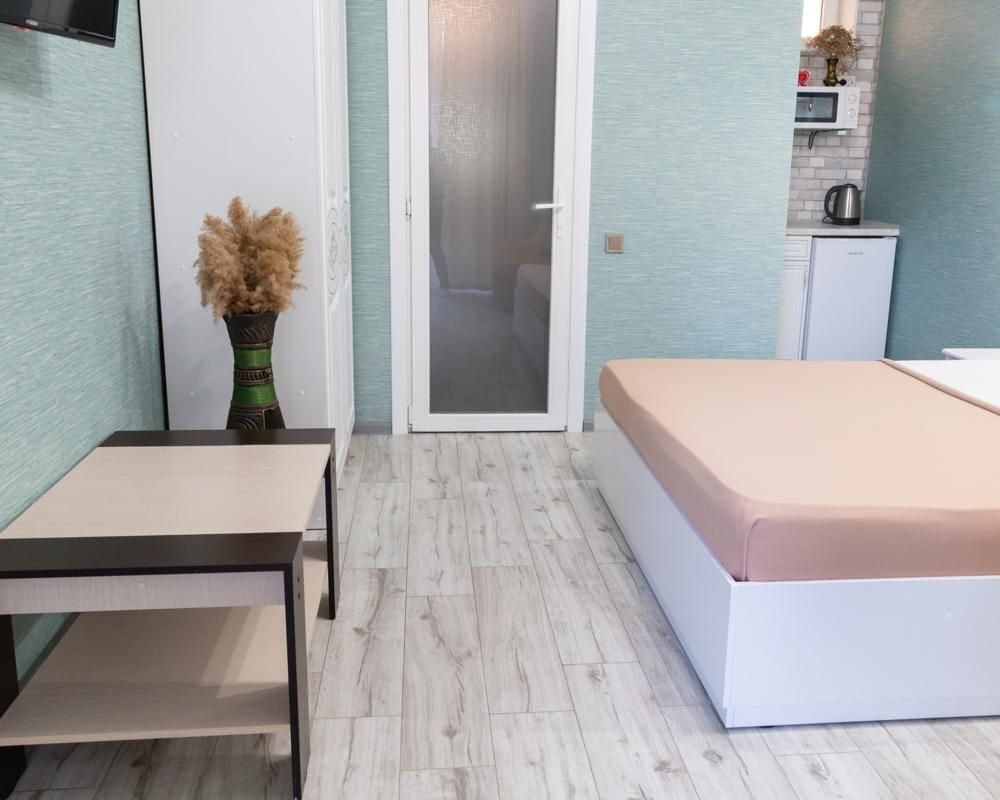 В однокомнатном номере есть мини кухня-микроволновая печь, эл. чайник, холодильник, посуда. Также: полотенца, тапочки, фен, мыло, гель для душа. Балкон общий со столиками и креслами. Бельё меняется по по требованию.