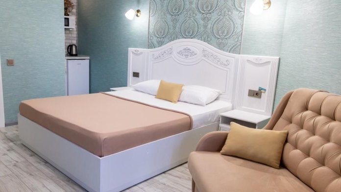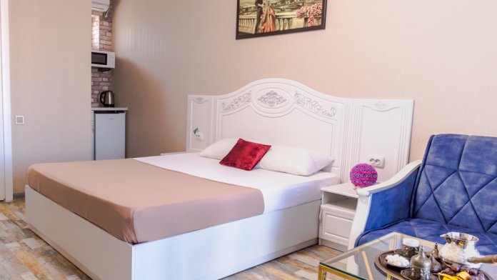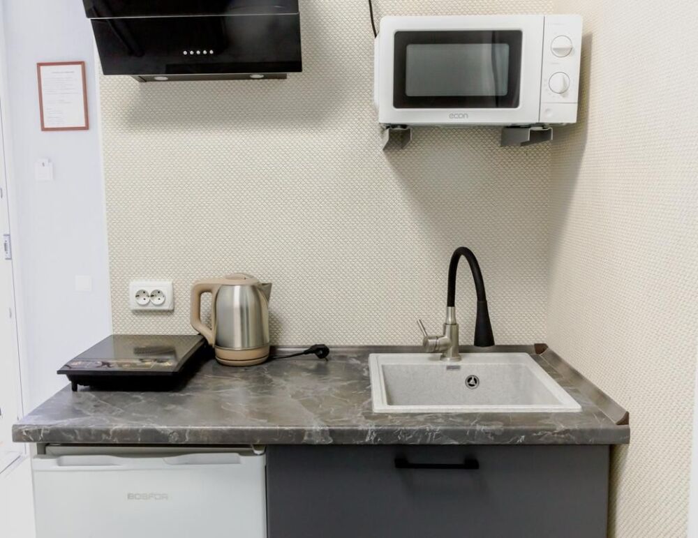 который вмещает 2 человека. В номере: микроволновая печь, электрочайник, холодильник, посуда.