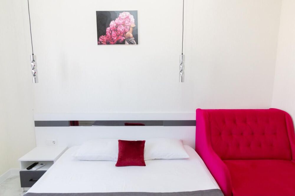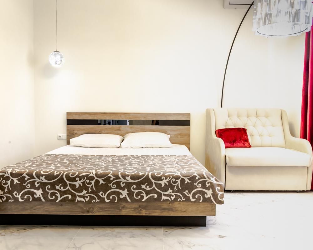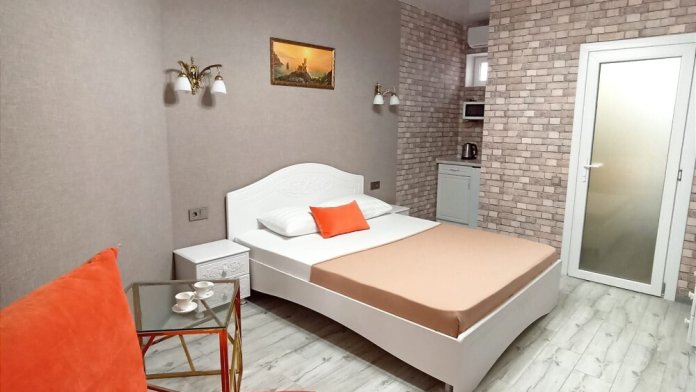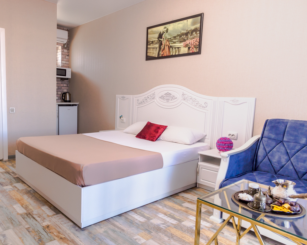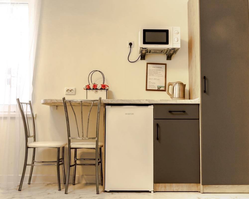 В номере спальня и комната- студия. Кухня с плитой и посудой в номере, холодильник, вытяжка. Стол со стульями.