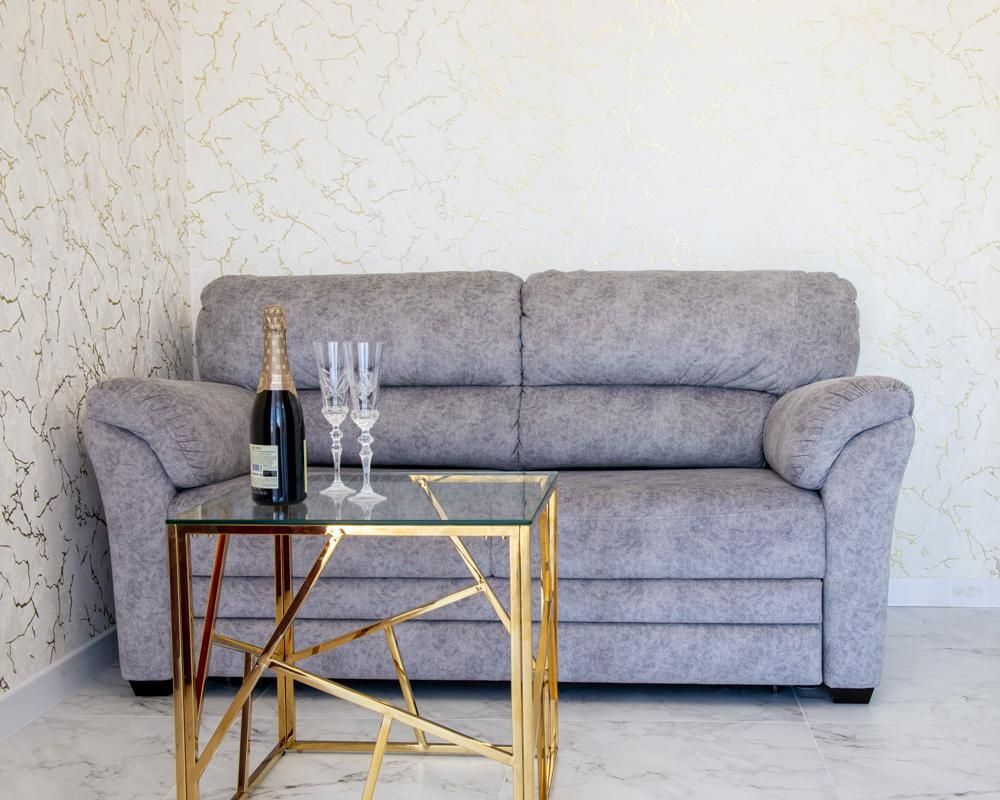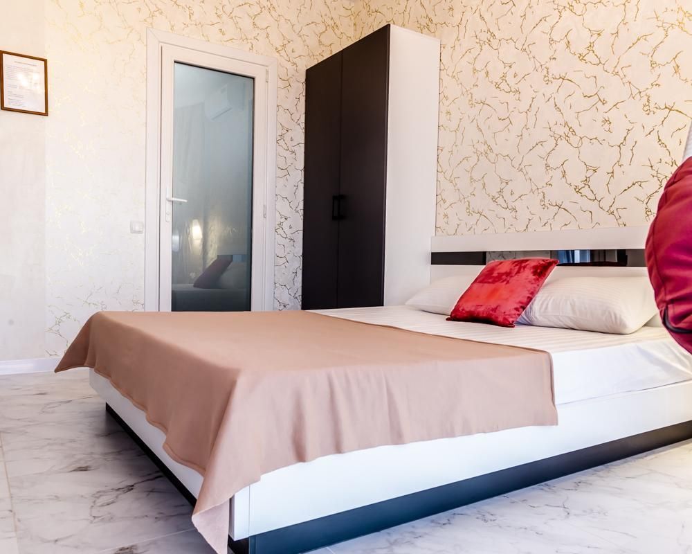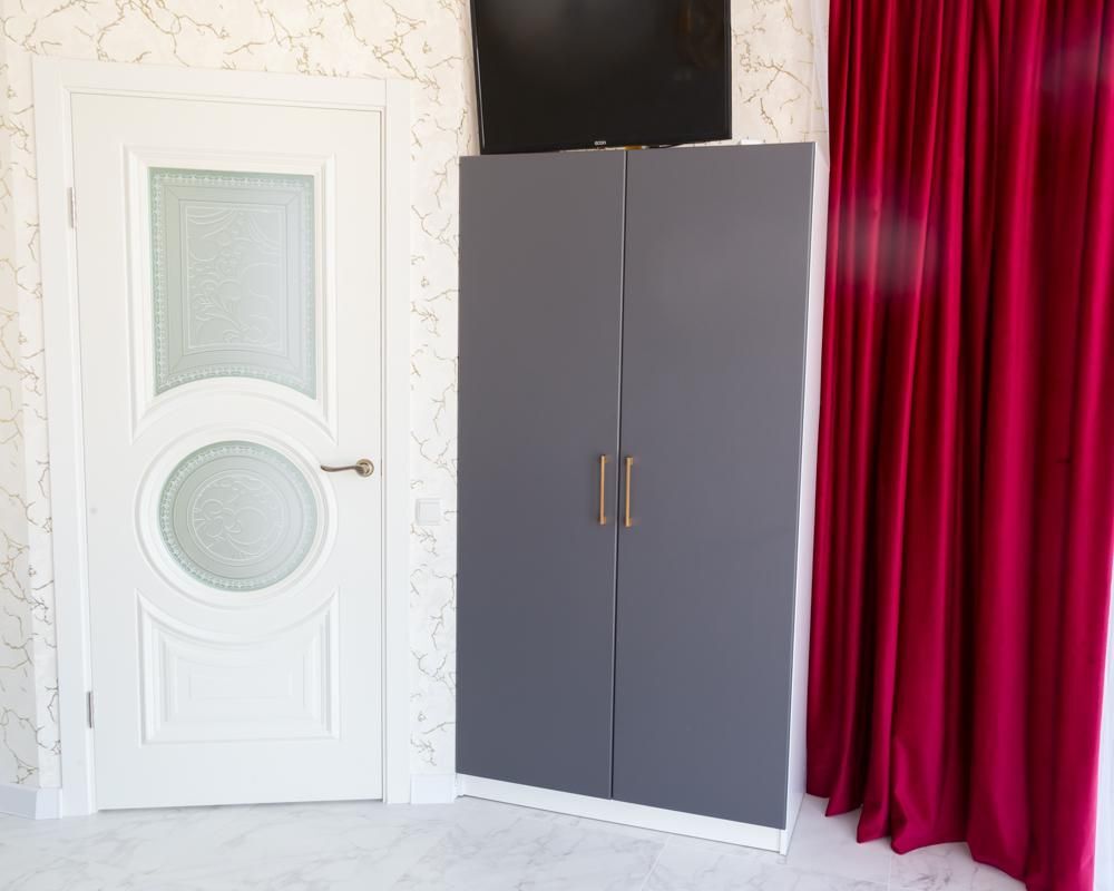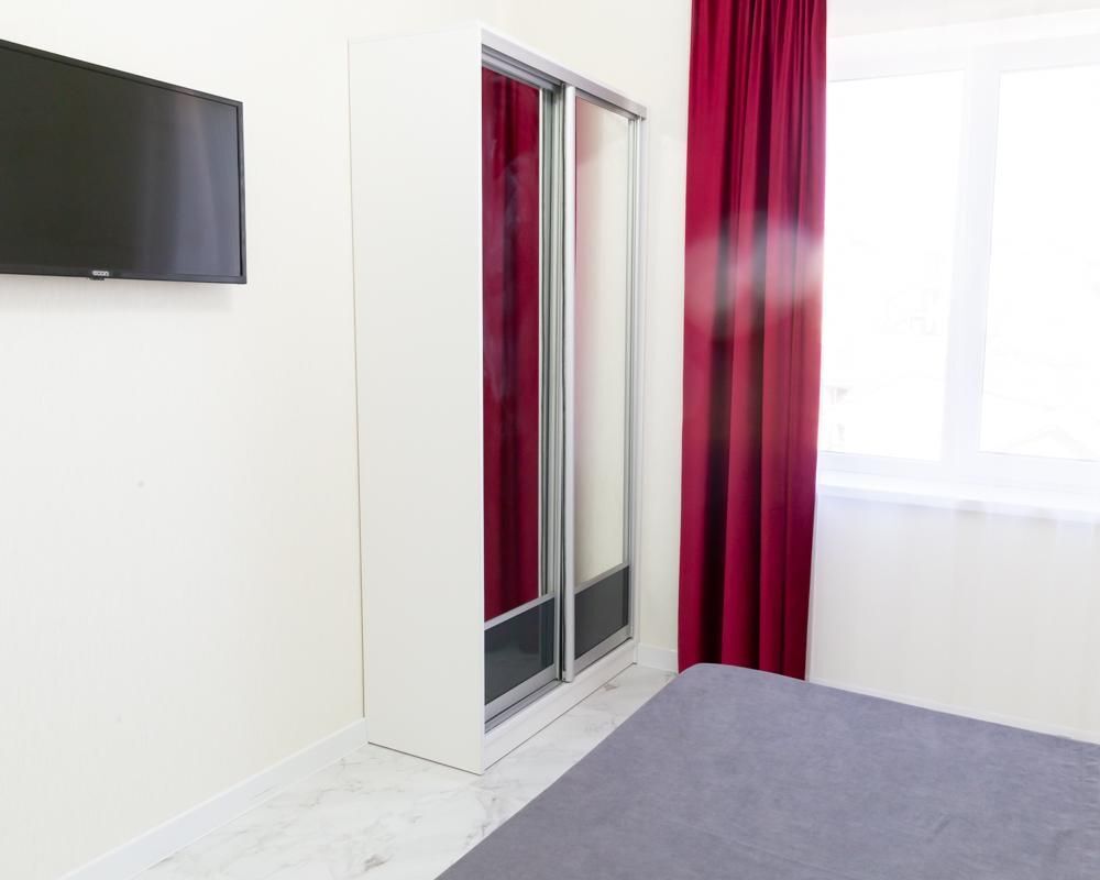 В номере спальня и комната- студия. Кухня с плитой и посудой в номере, холодильник, вытяжка. Стол со стульями.