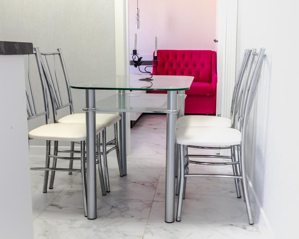 В номере: кухня с электроплитой, вытяжкой, мойкой, посудой, холодильник, столовый стол с стульями. Комнаты непроходные.