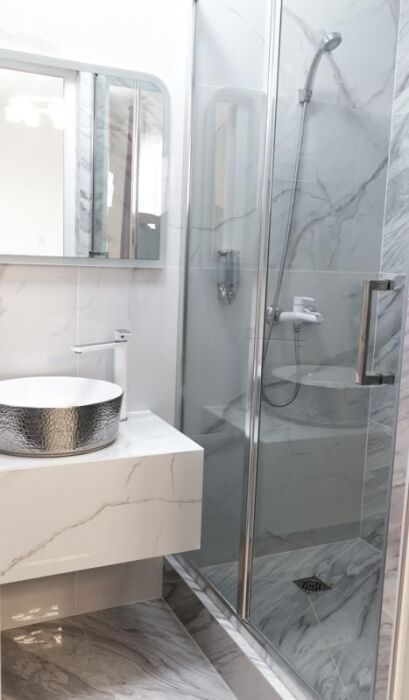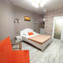 В номере кухня с эл. плитой, вытяжкой, мойкой, посудой, холодильник, стол с стульями. Душ с туалетными принадлежностями, полотенца, тапочки.