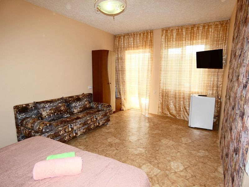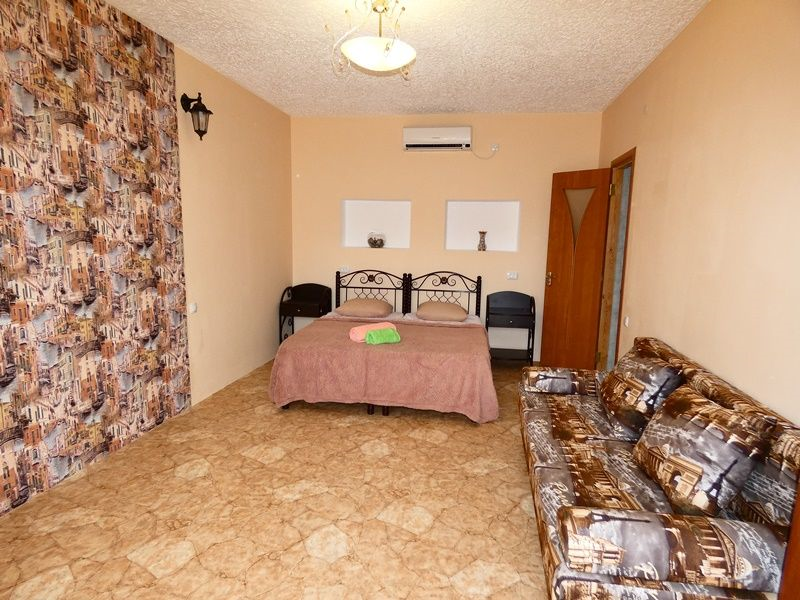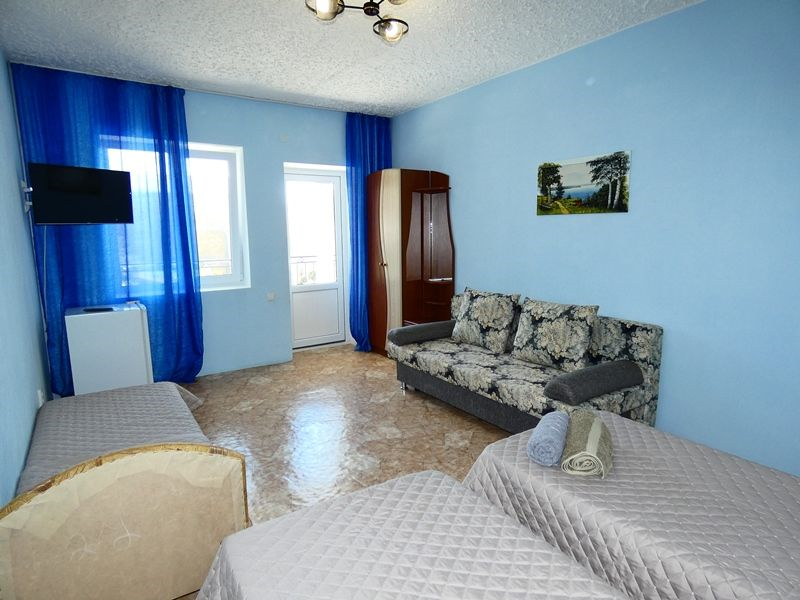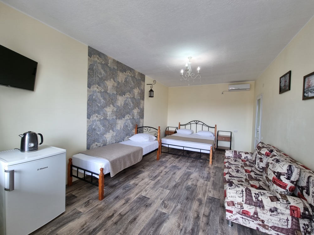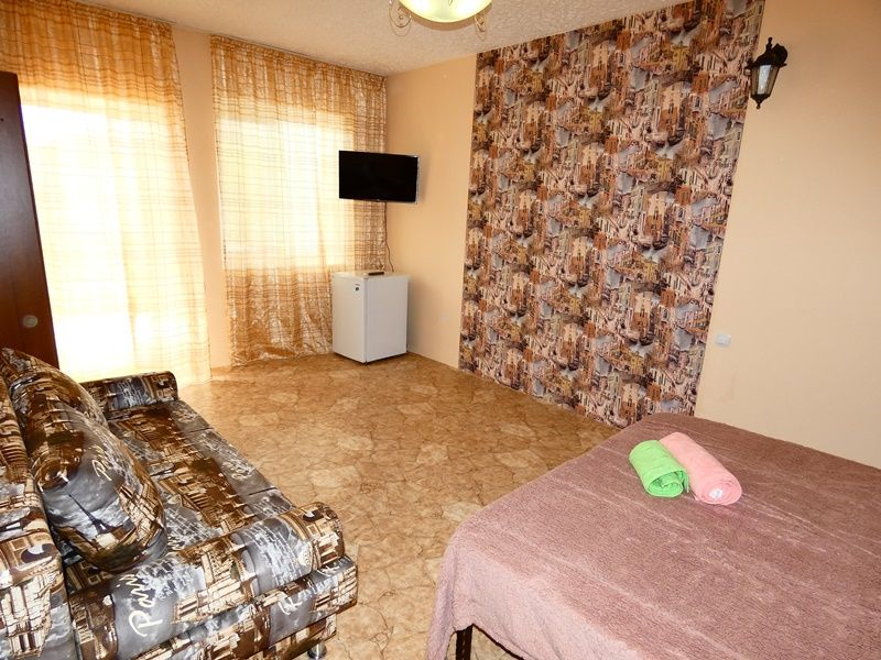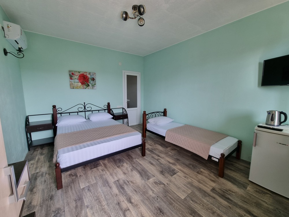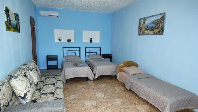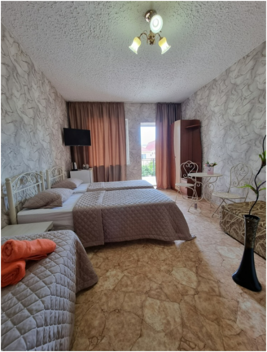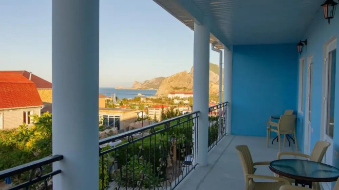В каждую комнату отдельный вход. В каждом номере отдельный санузел с душем, холодильник, телевизор, кондиционер, чайник. Номера с балконом и видом на море и Генуэскую крепость.