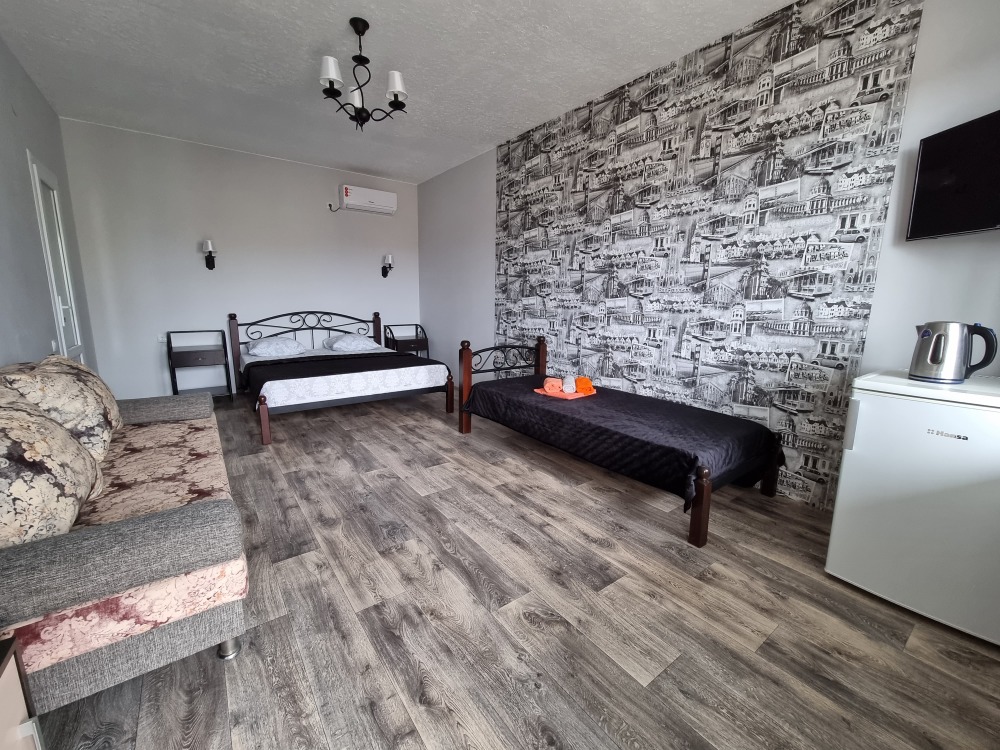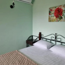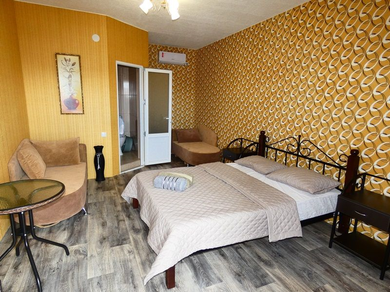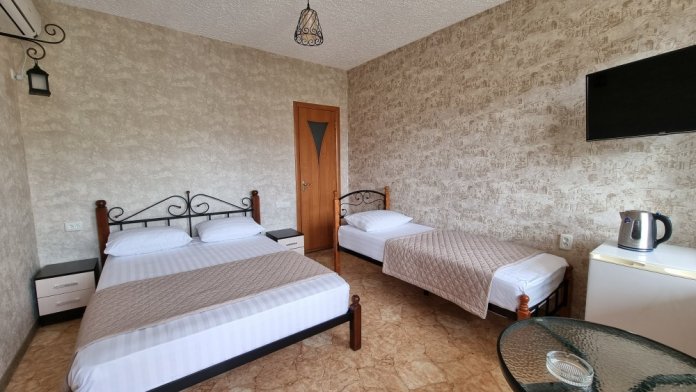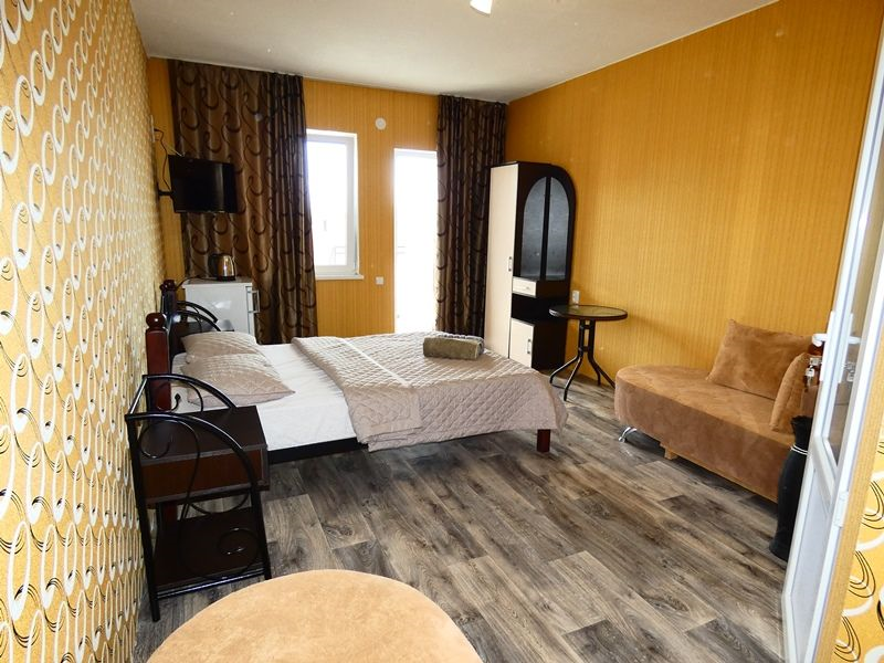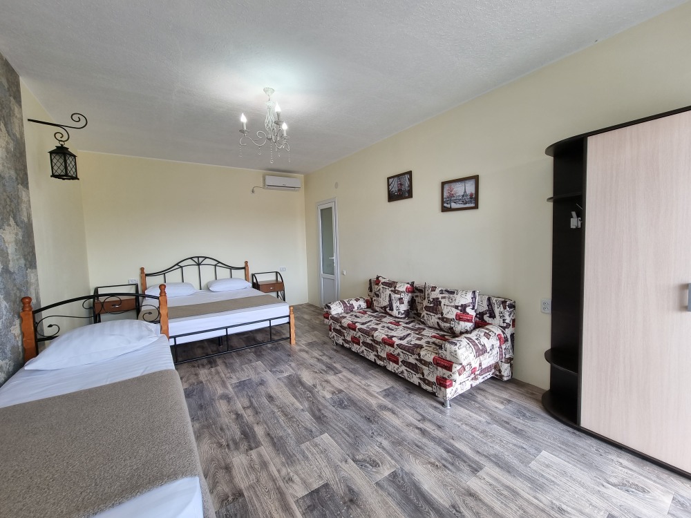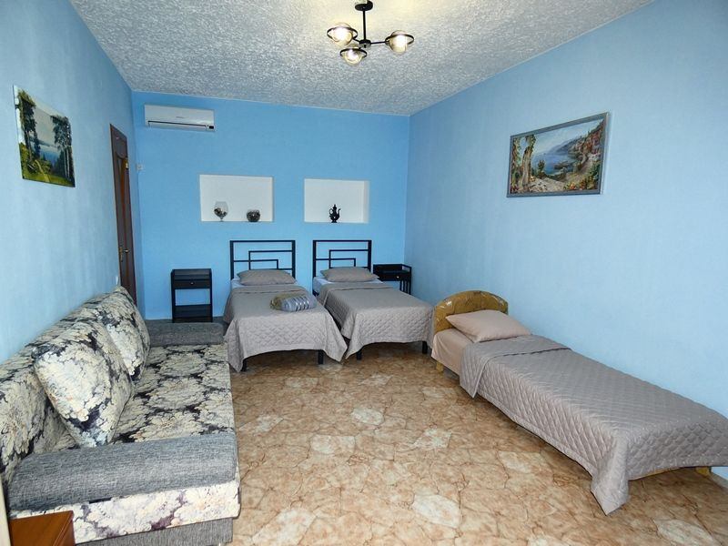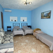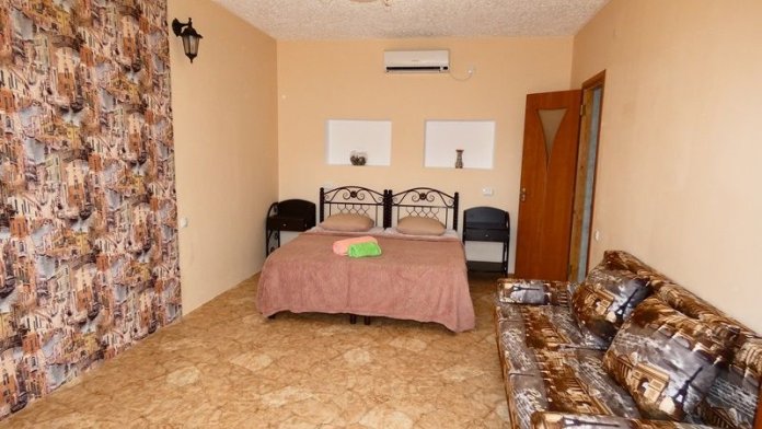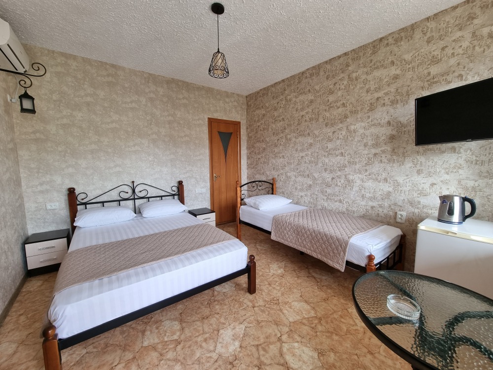 В каждую комнату отдельный вход. В каждом номере отдельный санузел с душем, холодильник, телевизор, кондиционер, чайник. Номера с балконом и видом на море и Генуэскую крепость.