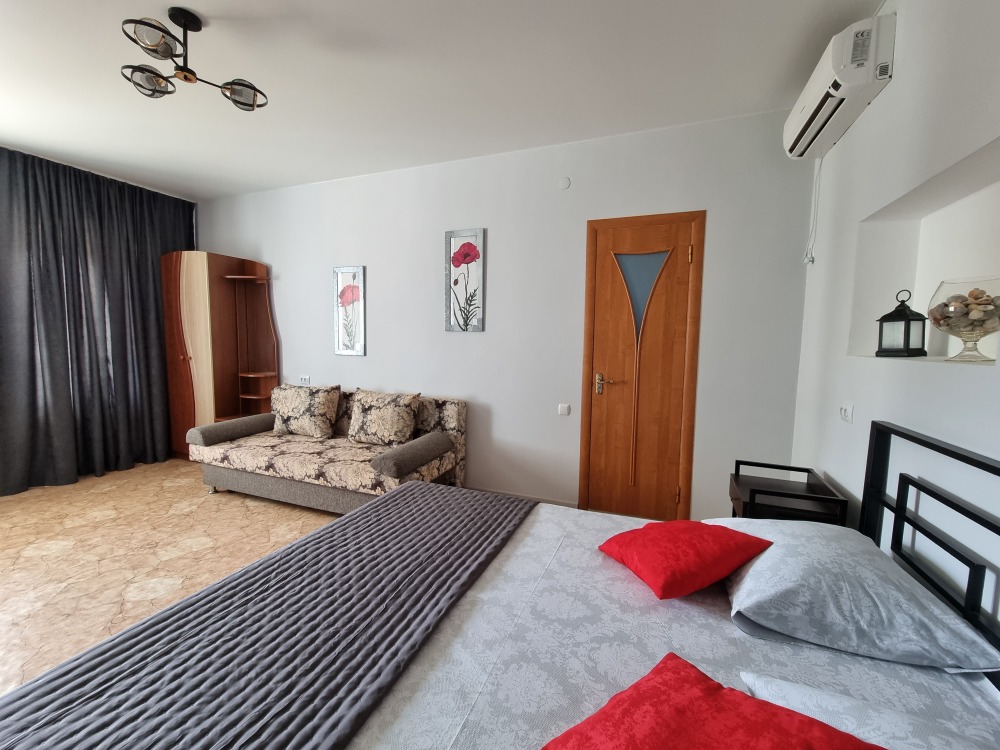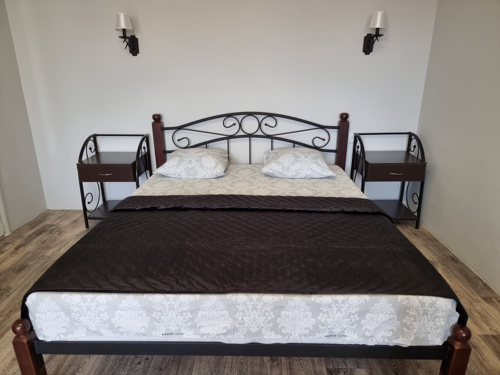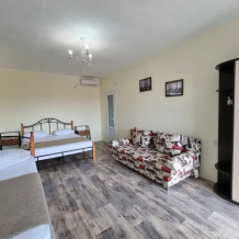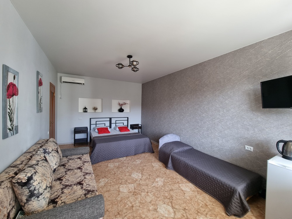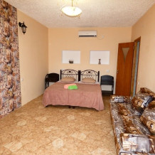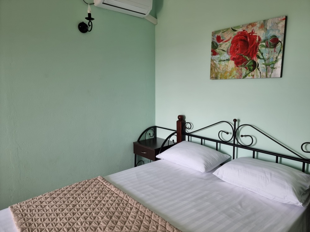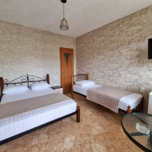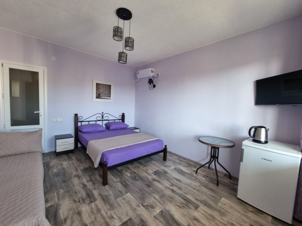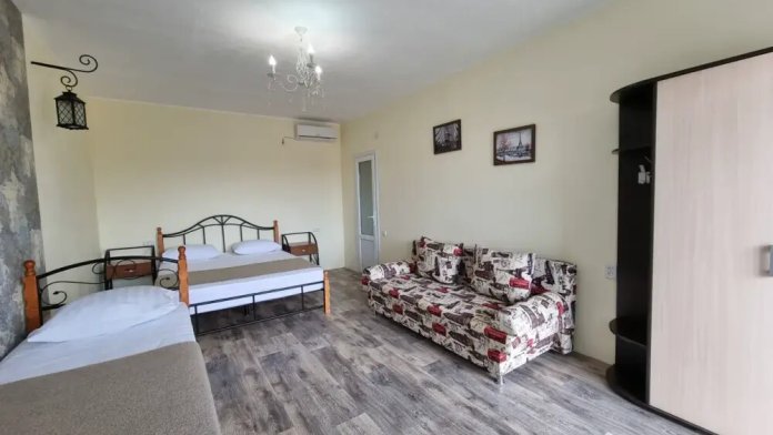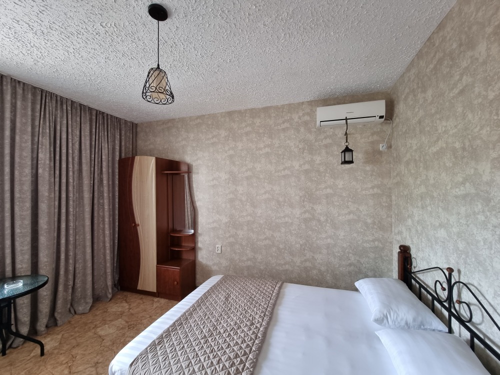В каждую комнату отдельный вход. В каждом номере отдельный санузел с душем, холодильник, телевизор, кондиционер, чайник. Номера с балконом и видом на море и Генуэскую крепость.