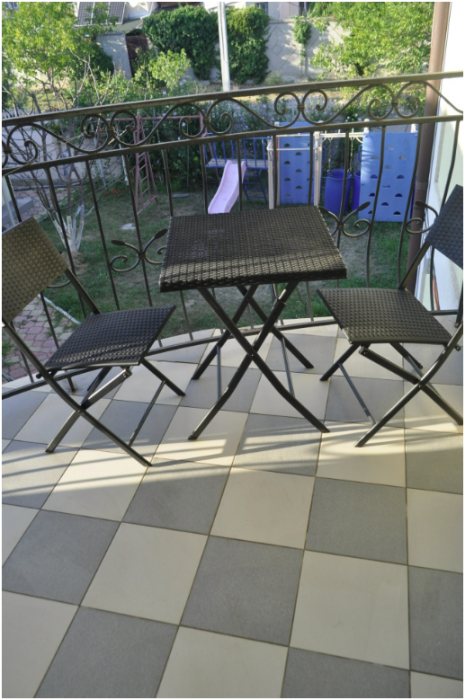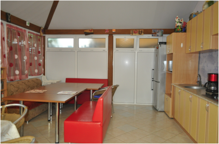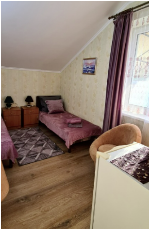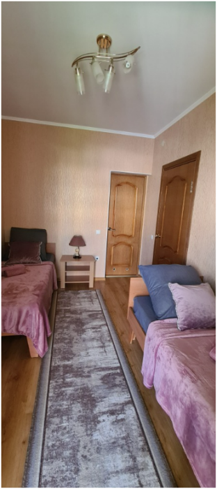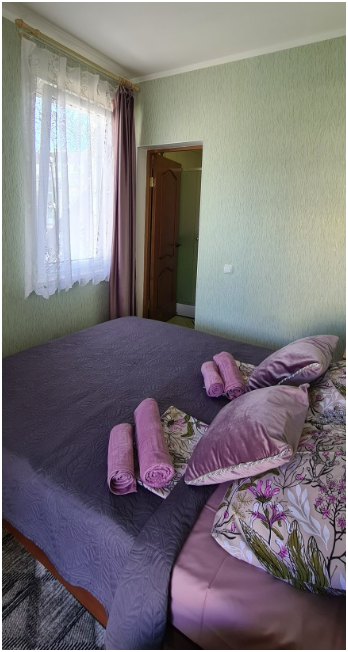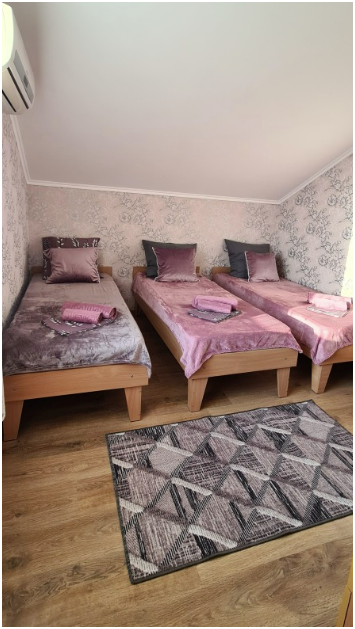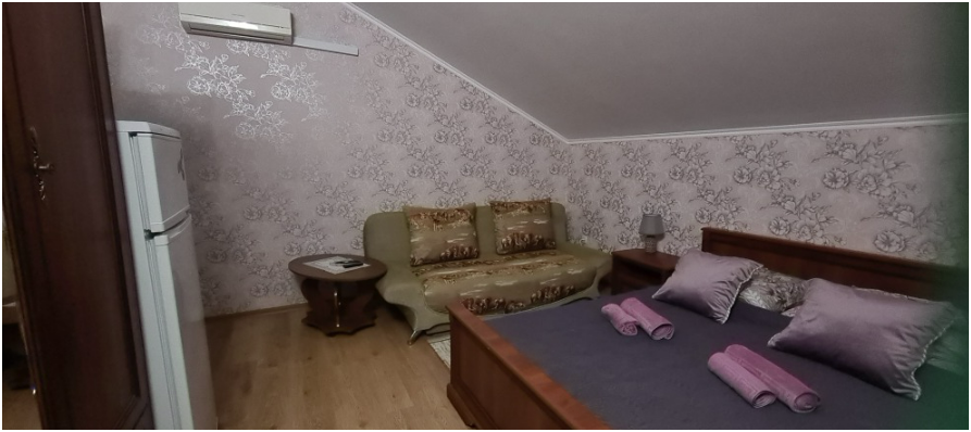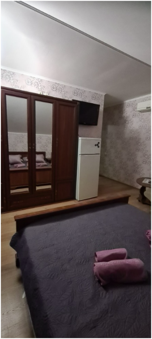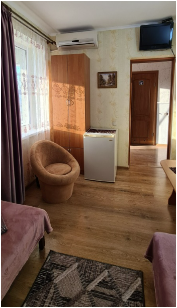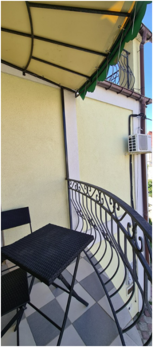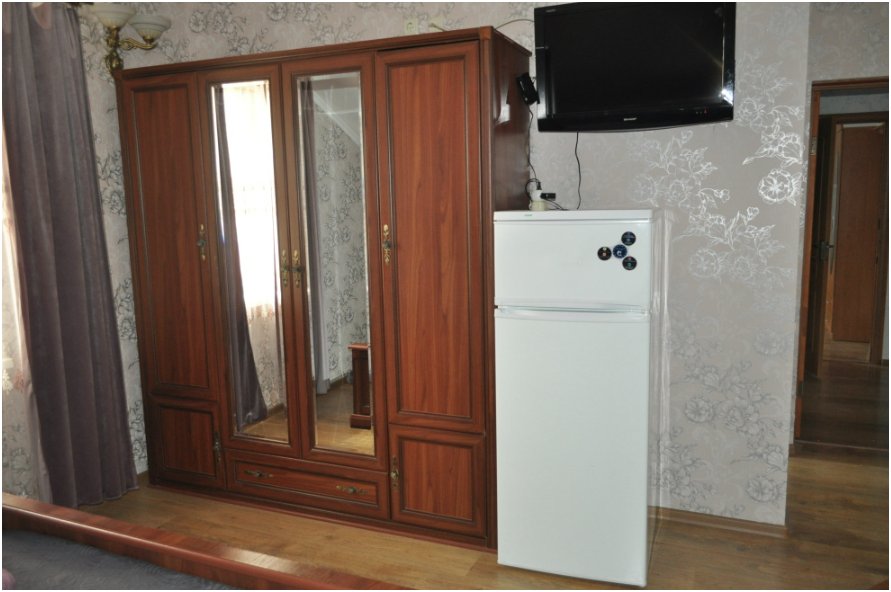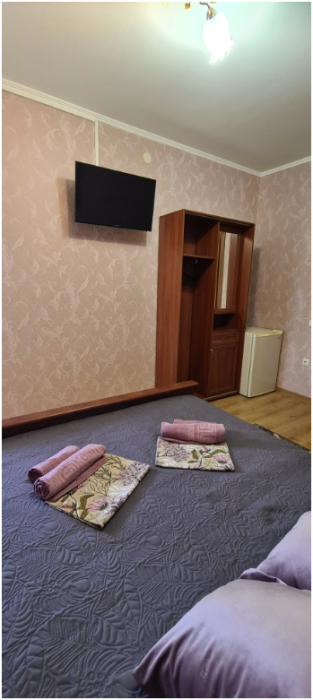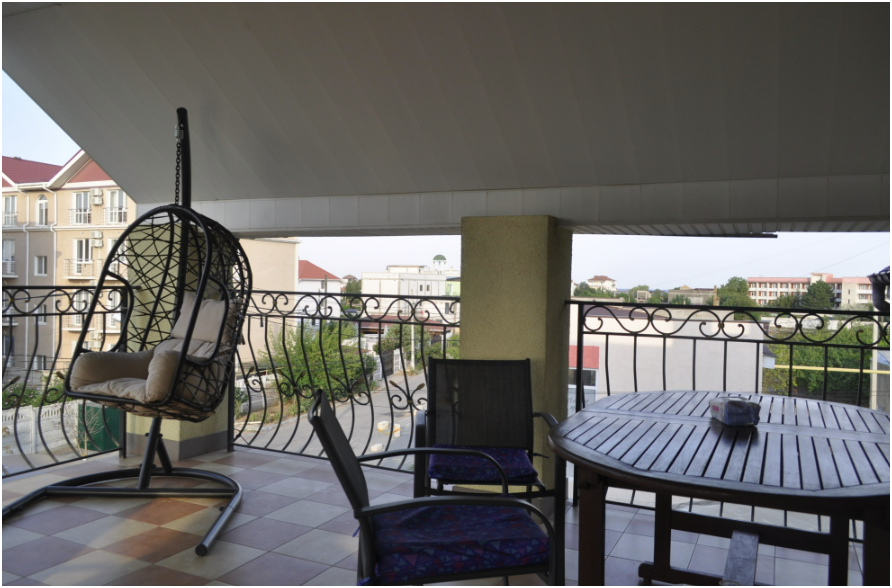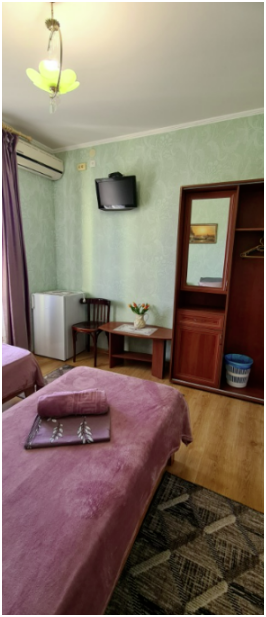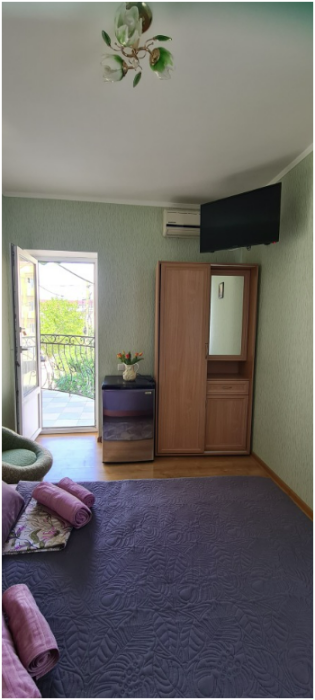 На 1-м и 3-м этажах расположены две общие оборудованные всем необходимым кухни для самостоятельного приготовления пищи. Имеются балконы – общие на 1, 2, 3 комнаты. На 3 этаже есть оборудованный для отдыха просторный балкон-терраса с выходом на кухню. Домашние уютные комнаты расположены на 3-х этажах. Во всех комнатах есть все необходимое для комфортного проживания: современная мебель, кондиционер, телевизор, Wi-Fi интернет. Вода холодная, горячая - круглосуточно. Гостям предоставляется бесплатная парковка авто под видеонаблюдением за территорией дома (при наличии свободных мест).
