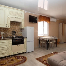 Для организации питания на территории гостевого дома размещена общая кухня с необходимой бытовой техникой и посудой (холодильники, электроплиты, электрочайники, микроволновка). Насладиться едой можно в тени уютной беседки, расположенной во дворе. Блюда на огне Вы можете приготовить в зоне барбекю. Во дворе предусмотрена парковка, красивый декоративный фонтан, детская площадка для малышей.