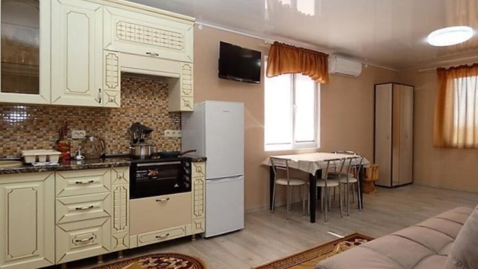 кухонный гарнитур, холодильник, необходимая посуда, микроволновая печь, кондиционер, чайник, стол и стулья, диван-кровать, шкаф