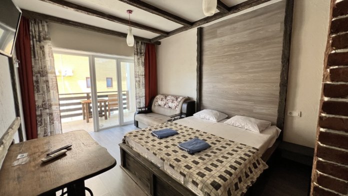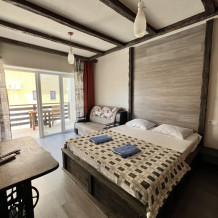 Номера с выходом на общую трассу. Оснащены кондиционером, холодильником, отдельным санузлом. На террасе место для отдыха (стол и стулья).