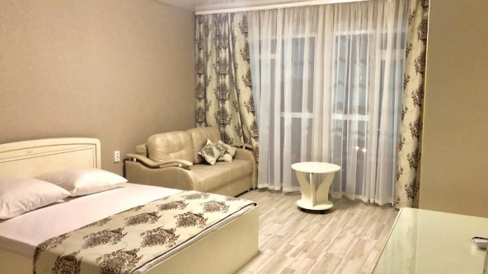Есть номера с балконом и без балкона. Холодильник встроенный в стол!