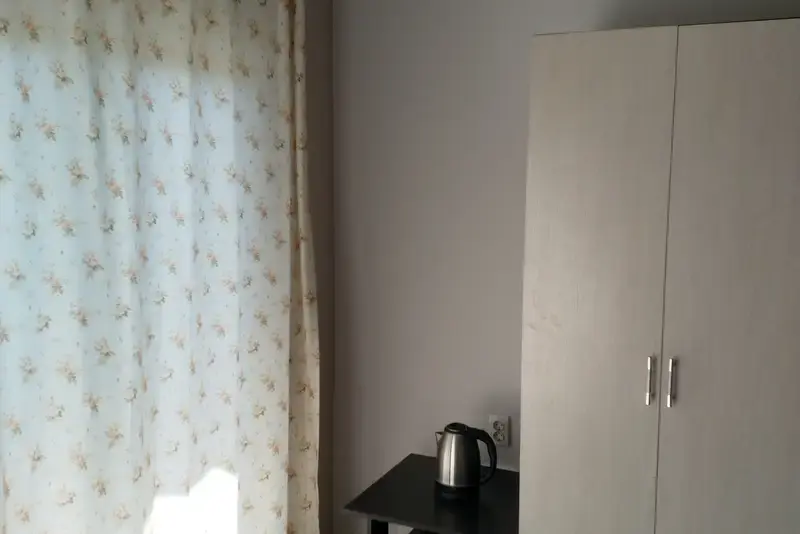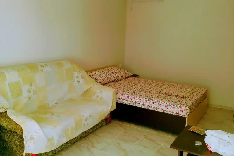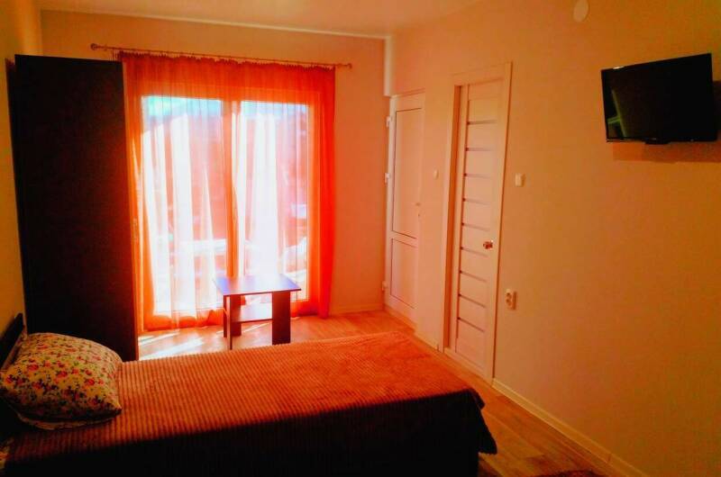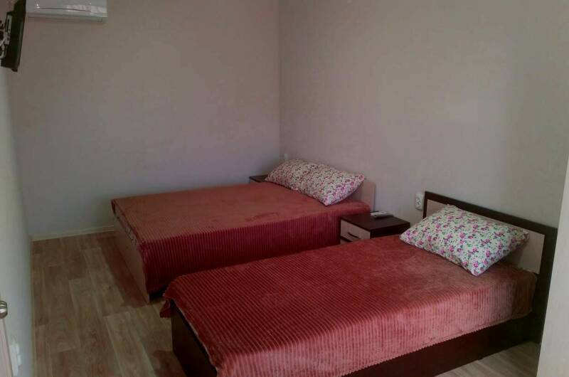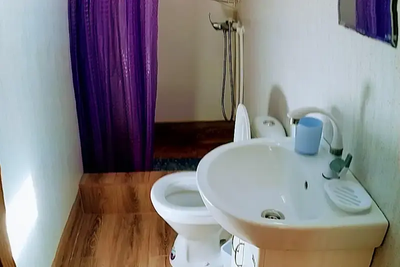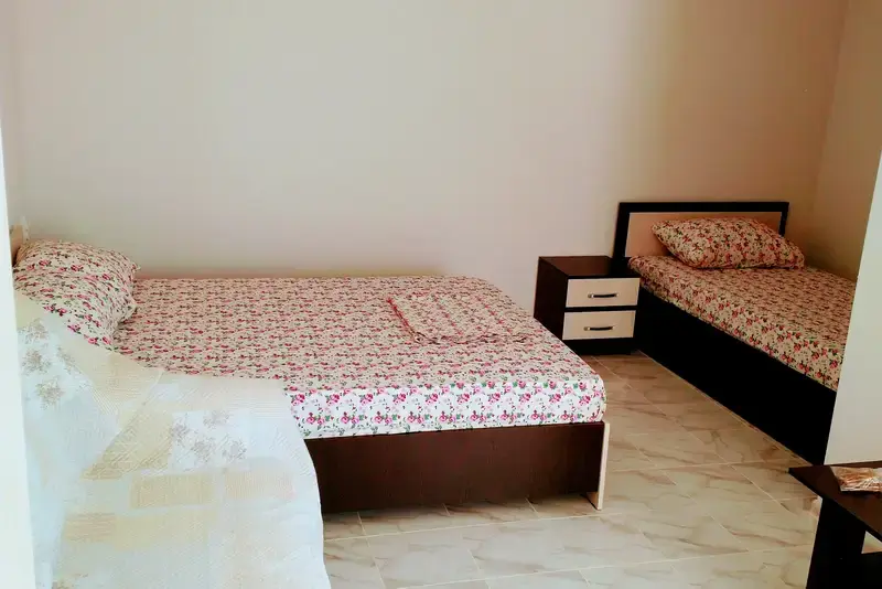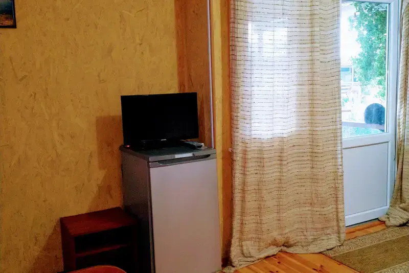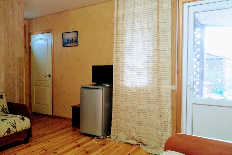 1-комнатный домик со всеми удобствами. Санузел с душевой, где есть постоянно холодная и горячая вода. В комнате двухспальная кровать и односпальная и, при необходимости есть возможность поставить дополнительно, ещё одну, полноценную кровать.
