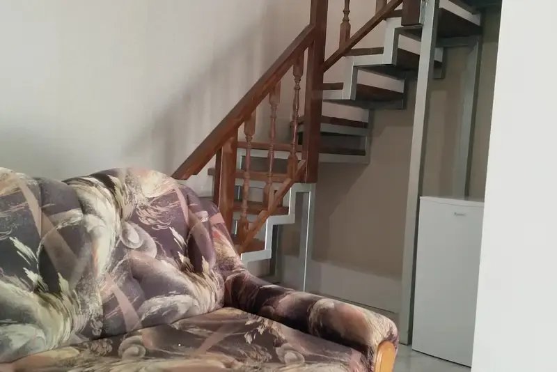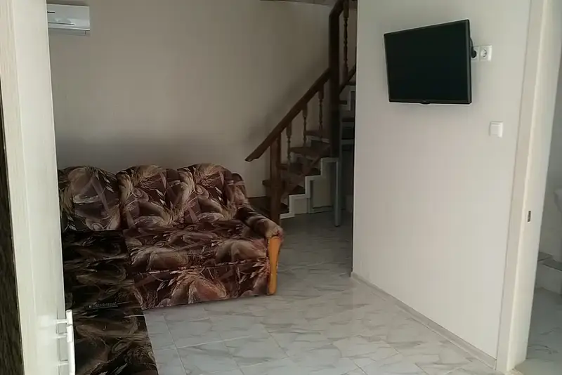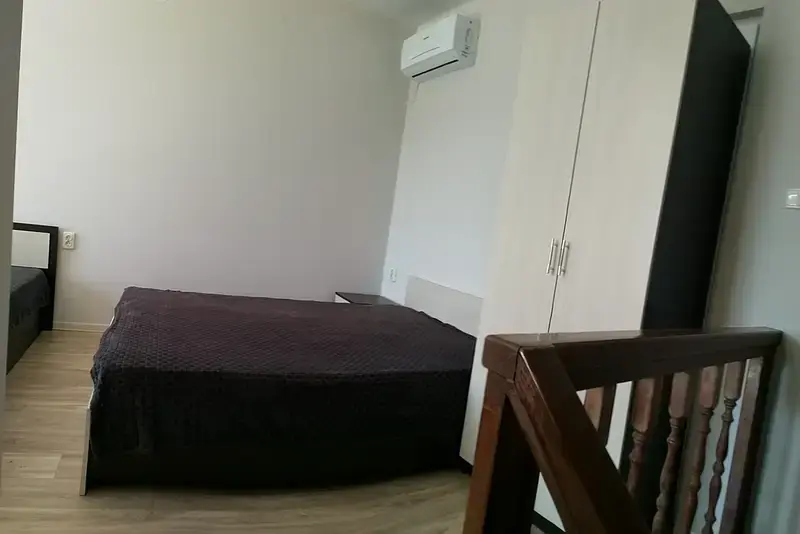 Двухкомнатная, двухэтажная мезонета. Первый и второй этажи, соединены лестницей в комнате. Первый этаж угловой диван раскладывающийся, на втором этаже кровати. На каждом этаже санузел с душем, телевизоры, кондиционеры, холодильники.