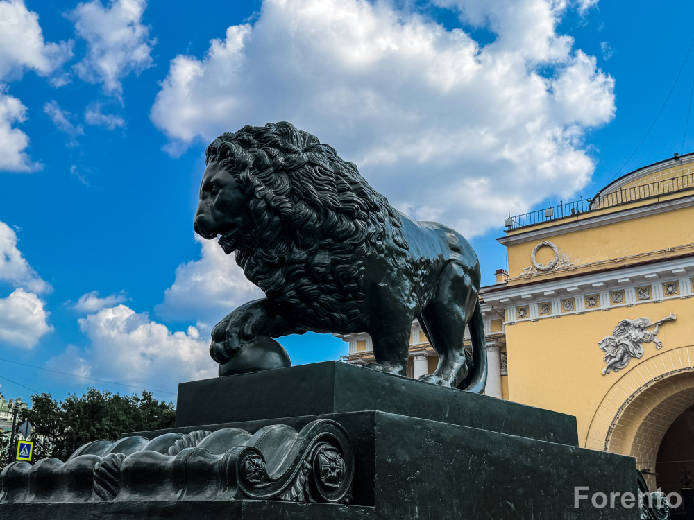 Одновременно с Дворцовой пристанью был создан Петровский спуск, расположенный у западного павильона Главного Адмиралтейства. В сентябре 1832 года здесь установили знаменитые медные скульптуры львов на гранитных пьедесталах — точные копии флорентийских львов, созданные по гипсовым слепкам с оригиналов. Фигуры были выполнены методом чеканки из листовой меди мастером И. Прангом по модели скульптора И. П. Прокофьева. Пьедесталы из чугуна изготовлены по проекту архитектора Л. Шарлеманя на Александровском чугунолитейном заводе. Эти львы стали символом города и любимым местом для фотосессий туристов и жителей Петербурга.